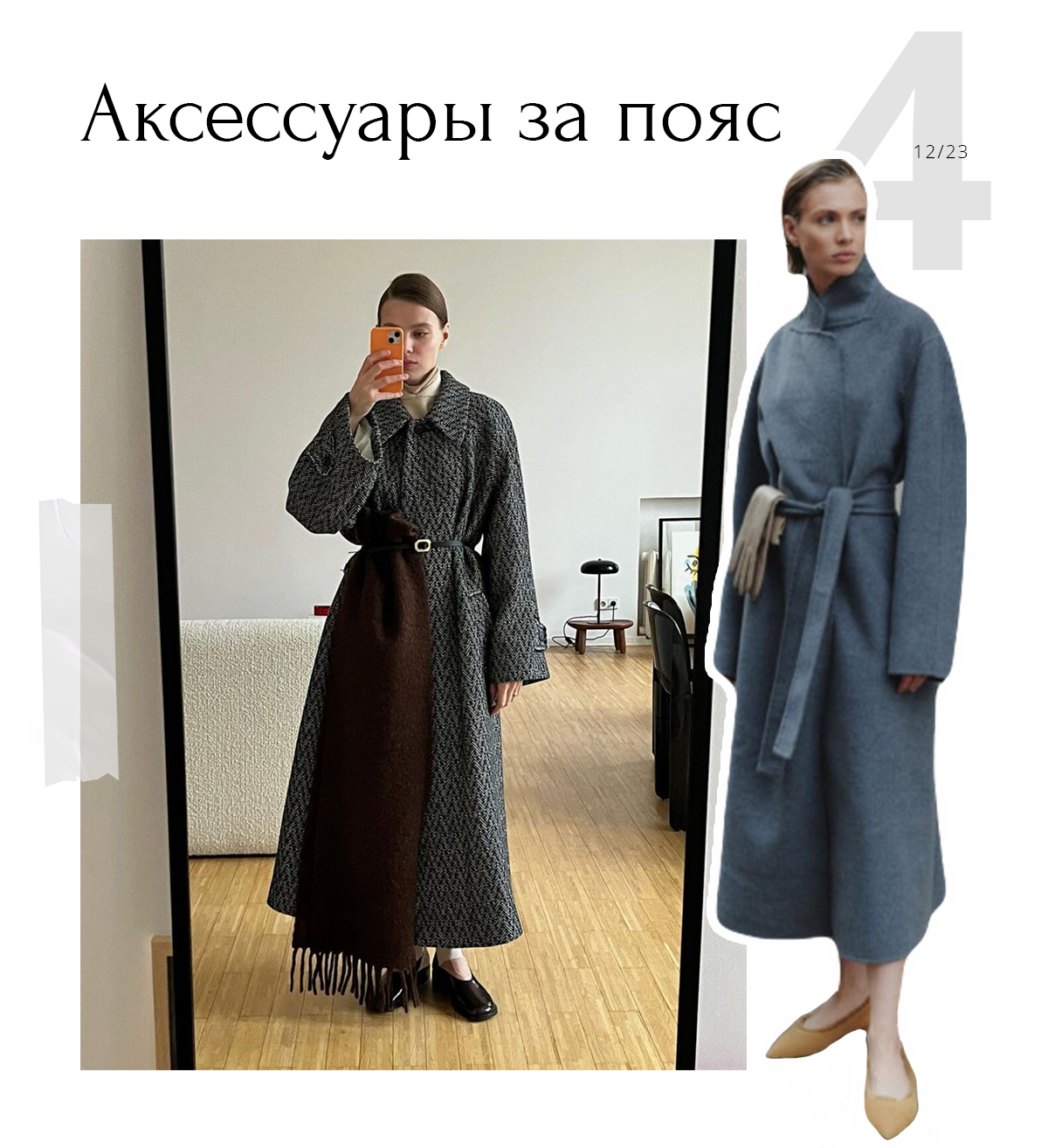 Заправлять аксессуары за пояс — сомнительный прием в плане практичности, но мы же сейчас скорее про необычность. Это интересно и ново. Пользуйтесь! Например, заправьте за пояс пальто шарф или даже перчатки.