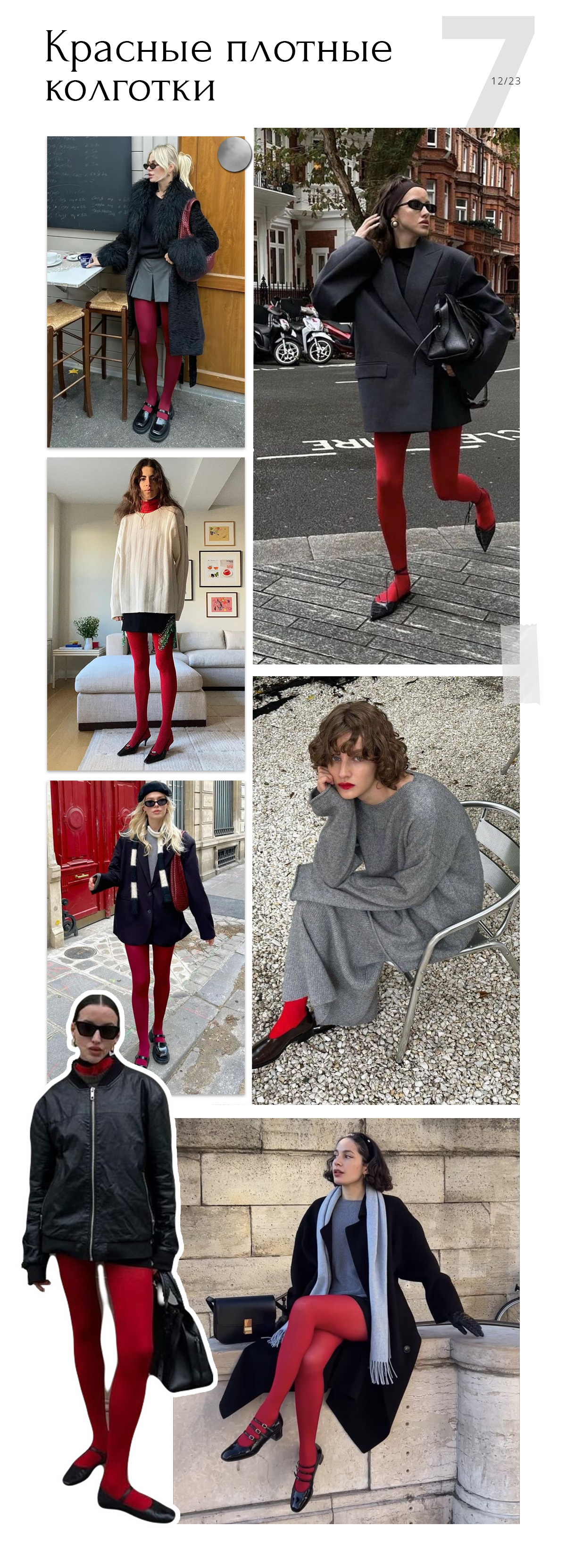 Плотные красные колготки — это огненно. Они особенно хорошо смотрятся в минималистичных, лаконичных образах.