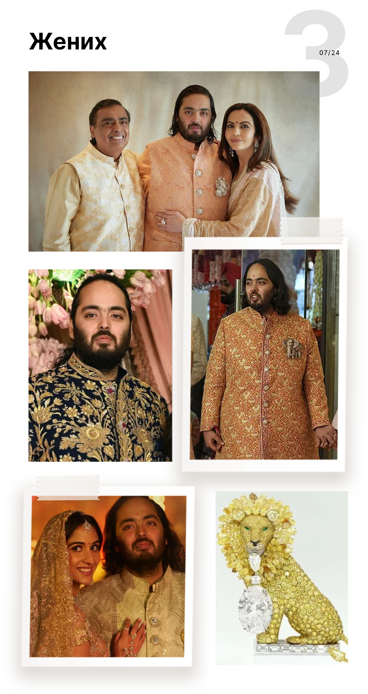 Наряды жениха отличались одной важной деталью: броши в виде разных зверей. Анант Амбани занимается спасением животных. По его инициативе и на деньги Reliance Industries — компании его отца — был построен центр спасения диких животных площадью 1,2 га. Среди прочего, в нем есть госпиталь для слонов. С помощью украшений, многие из которых созданы на заказ, жених транслирует свою любовь к животным.