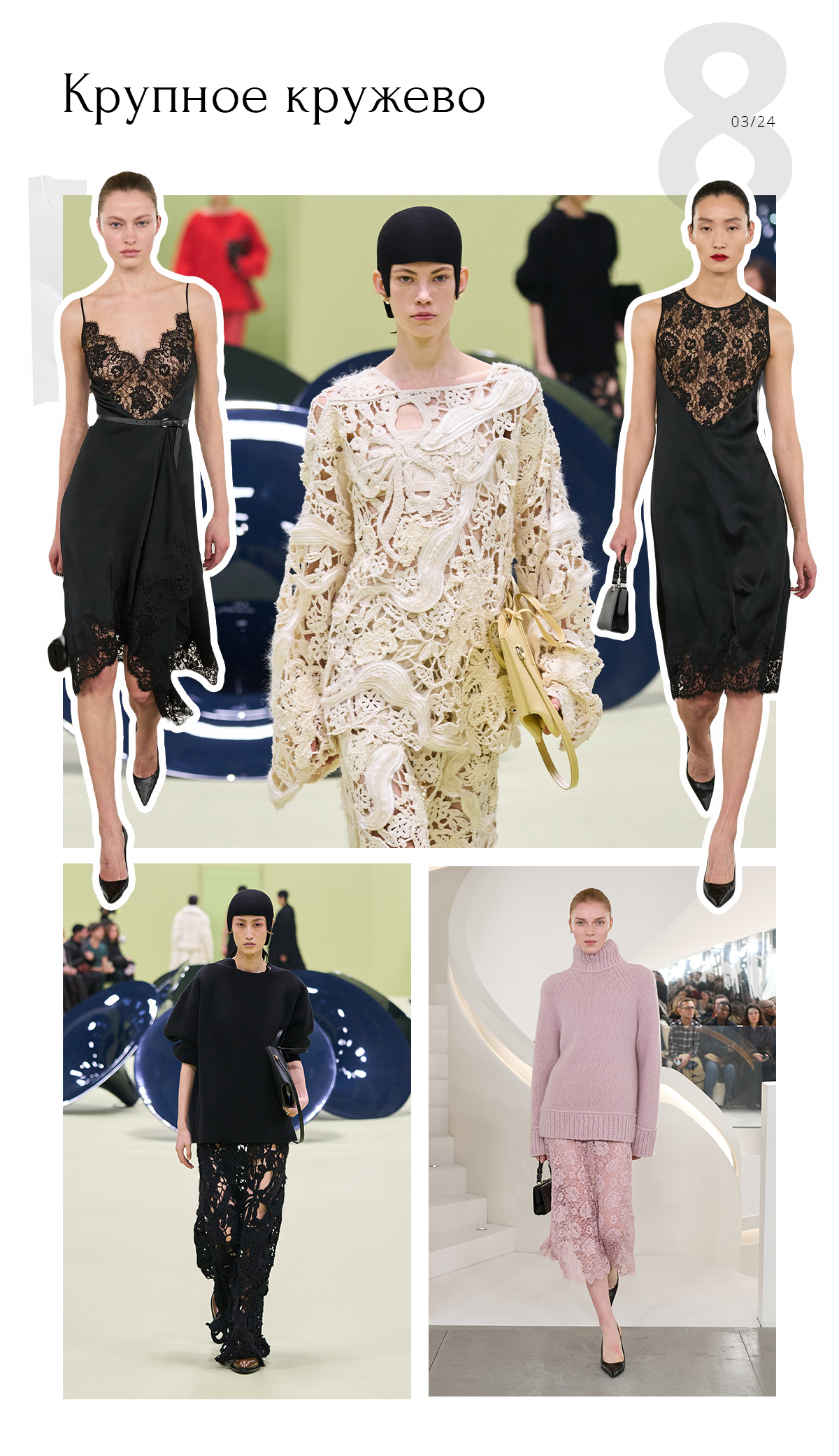 Еще одна новая фактура — крупное кружево. Платья, брюки, юбки, джемперы — подходит для всего. Если вы умеете вязать крючком, то сделайте хендмейд.