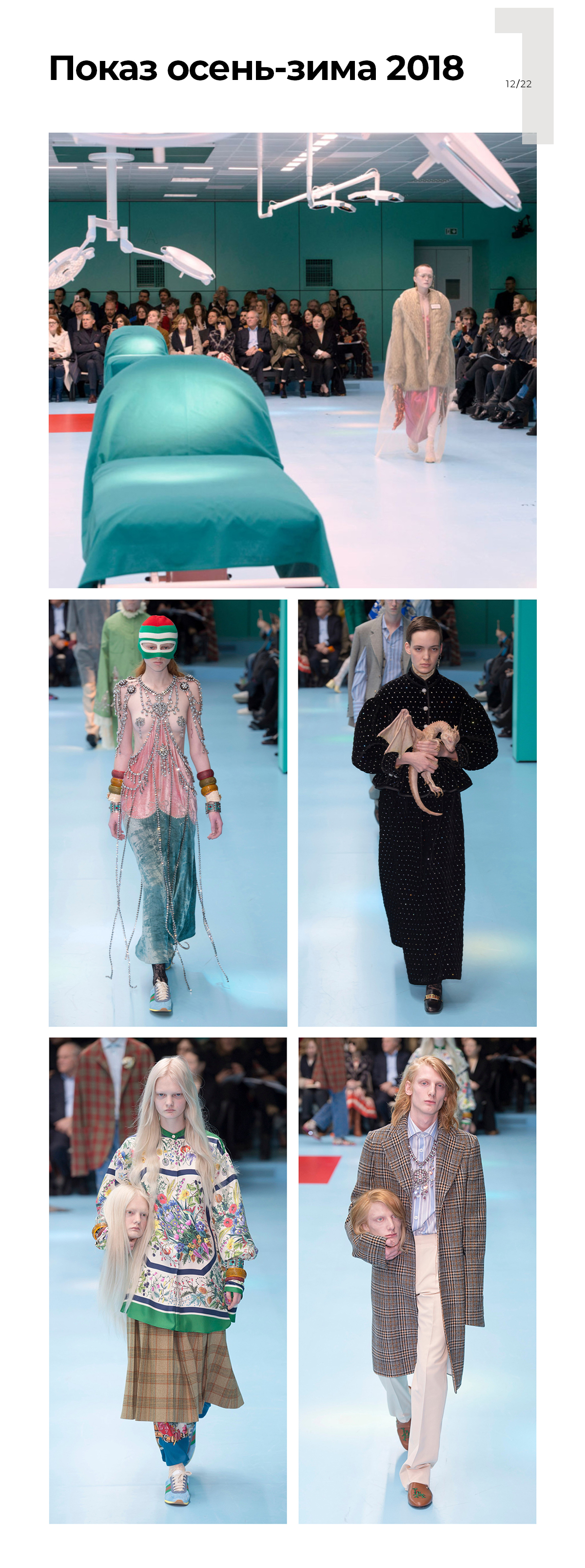 На показе осень-зима 2018 модели выходили на подиум с собственными головами вместо сумочек, а подиум напоминал операционную. Такой перформанс — не плод больной фантазии дизайнера, в нем много смыслов. Это отсылки к средневековым историям об обезглавленных мучениках, смерти гендерных стереотипов и понятия it-bag. То есть нет больше списка обязательных вещей, которые должны быть у статусного человека, и смотреть на моду нужно шире.