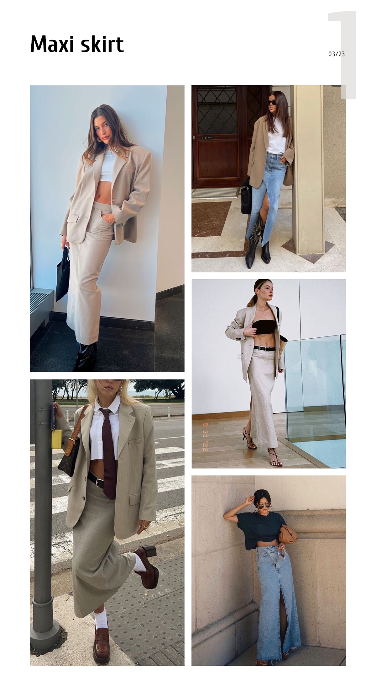 Maxi skirts came to smash the minis. Polina chose a maxi denim skirt to pair up with good old basics, like a plain tee. Take a look at these models: Cameron, Blake, and Jane.