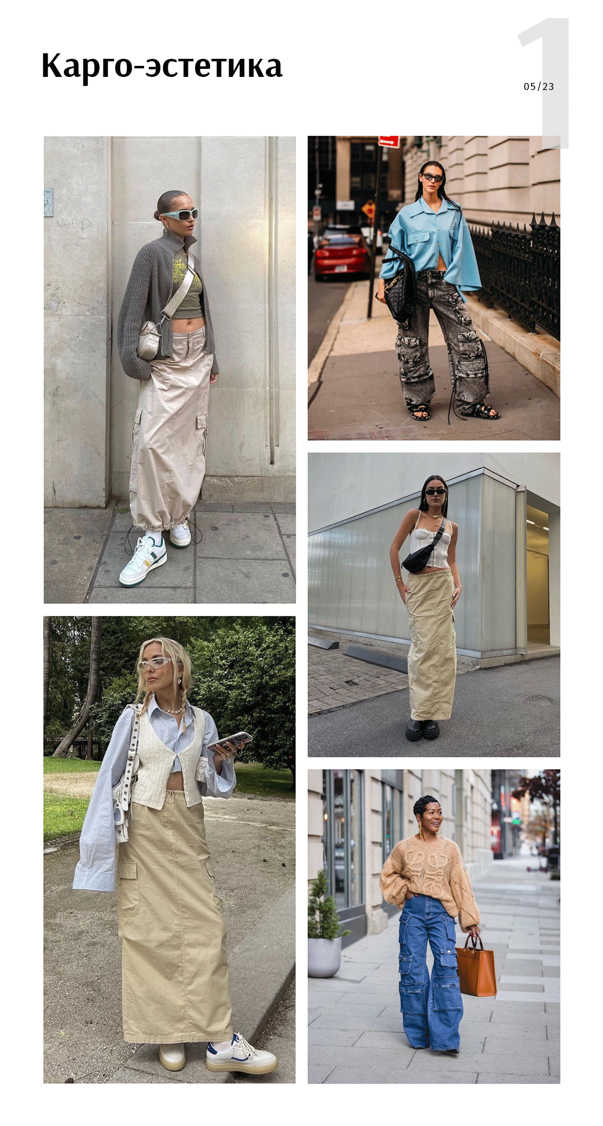 Эстетика карго не сдает позиций и даже расширяет свое присутствие. В гардеробе современной модницы есть юбки-карго, брюки-карго или брюки-парашюты.