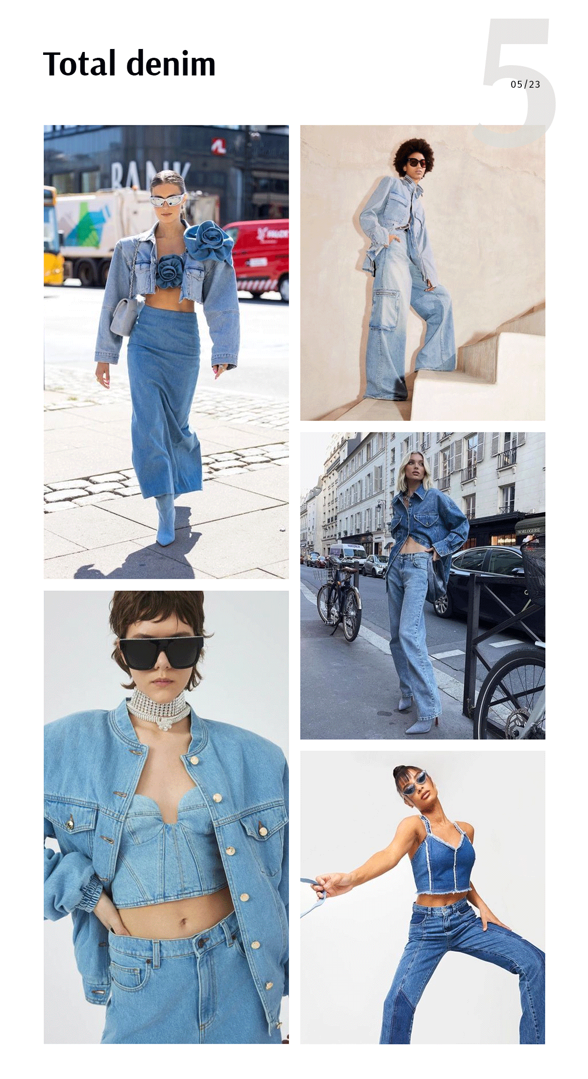 Самый модный лук этого лета — полностью из денима. Это касается не только одежды, но и аксессуаров, и добавить можно обувь из джинсы, сумку и украшения. Самое прекрасное в том, что действует простейшая формула, которую легко повторить, — ограничений нет. Какой выбрать деним? Любой. Одного цвета или разного, потертый, рваный — любой возможный микс.