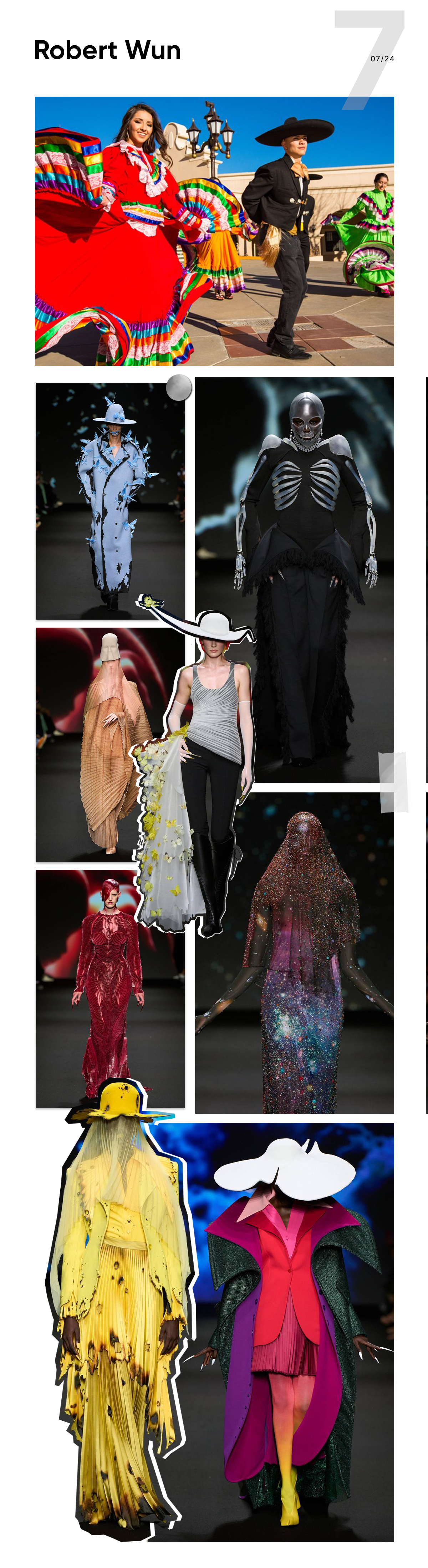 Сюр-кутюр от Robert Wun. Мы видим много отсылок к мексиканской культуре, в том числе празднику смерти, и оммажи на собственную, предыдущую коллекцию. Красиво, сумасшедше и зрелищно.