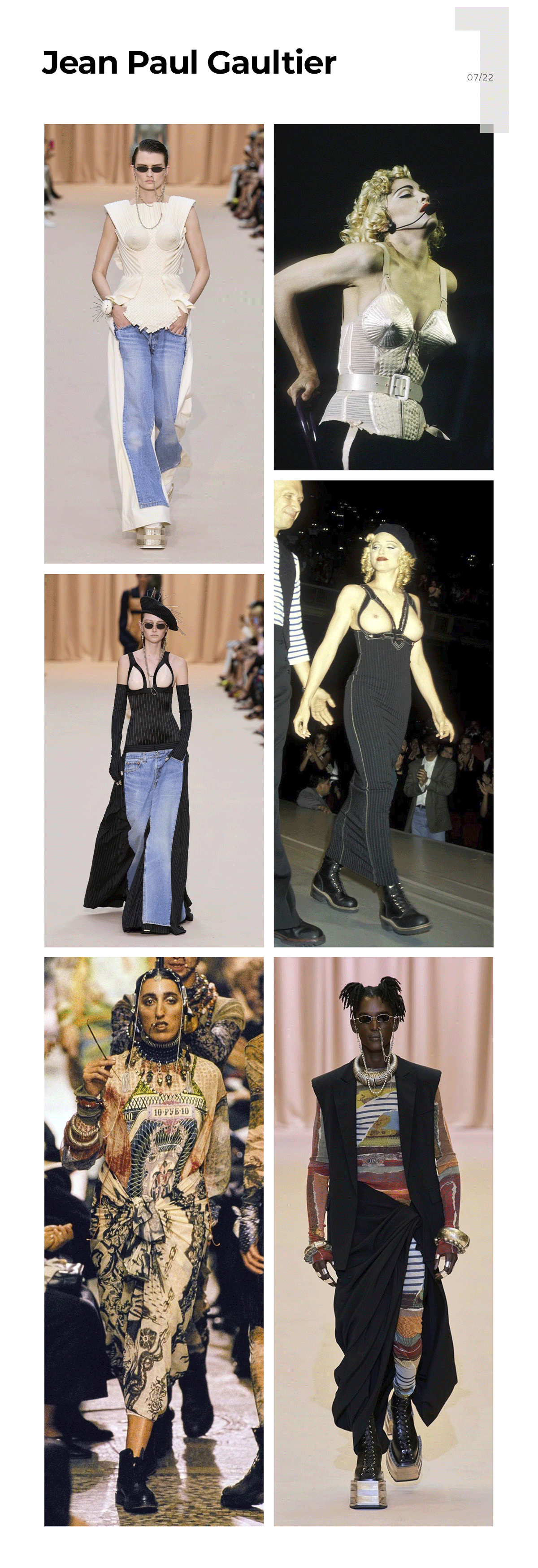 Бесспорно, коллекция Jean Paul Gaultier — один из лучших показов сезона, который хочется бесконечно разглядывать. Готье славится коллаборациями с различными дизайнерами, и в этот раз над его кутюром работал Оливье Рустем, который сейчас трудится в Balmain. В показе для Jean Paul Gaultier много тонких оммажей (от фр. hommage — признательность, дань уважения) на творения самого Готье — лифы-конусы, корсеты, деконструкции из жакетов, морская тема бренда, а также «приветы» знаковым парфюмам Le Male и Clasique.
