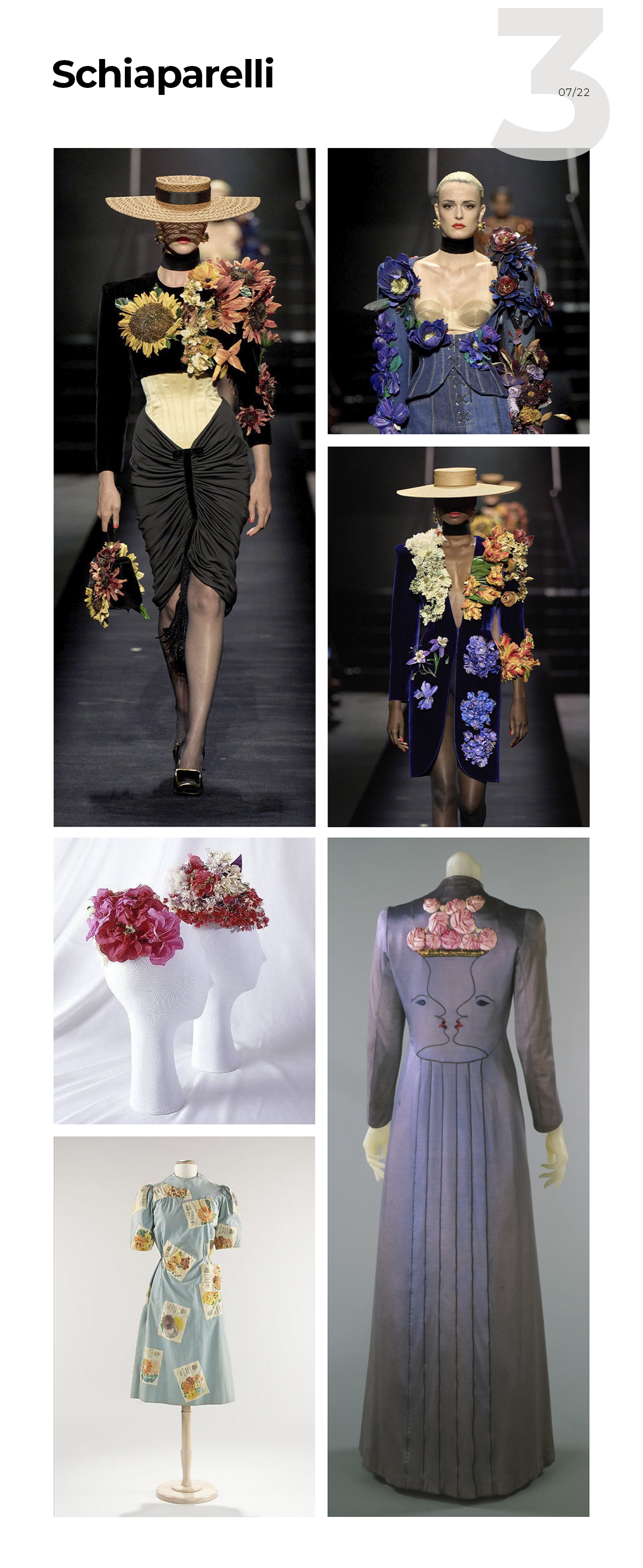 Креативный директор дома Schiaparelli Дэниел Розберри в свое время вернул к жизни бренд. Он показал отличное знание истоков, того, что вдохновляло основательницу модного дома — Эльзу Скиапарелли. В этот раз кутюрный показ отличался от привычных. Вместо обилия золота и анатомичности было много бархата и, конечно, цветов, как символа райского сада. К слову, цветы — знаковый символ для самой Эльзы, которая часто использовала их в декоре своих работ.