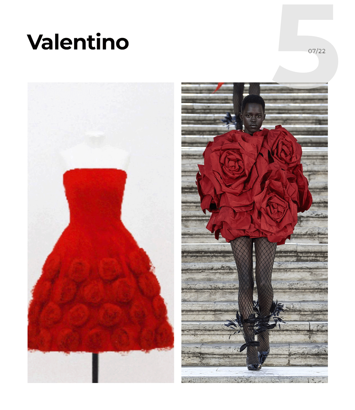 Еще один показ-шоу, который проходил в шикарных уличных декорациях — на Испанской лестнице в Риме. Здесь было много личного для бренда. Во-первых, место проведения. Именно в Риме Валентино Гаравани основал свой модный дом. Показ на Испанской лестнице — тоже момент из истории бренда, который уже проводил шоу в этой локации в девяностых. Ну и, конечно, важный момент в коллекции — возвращение знакового цвета Red Valentino. Вишенка на торте — прекрасный оммаж на дебютную коллекцию бренда Valentino 1954 года, где было красное платье, украшенное розами. Вещи с прямой отсылкой есть и в новой коллекции.
