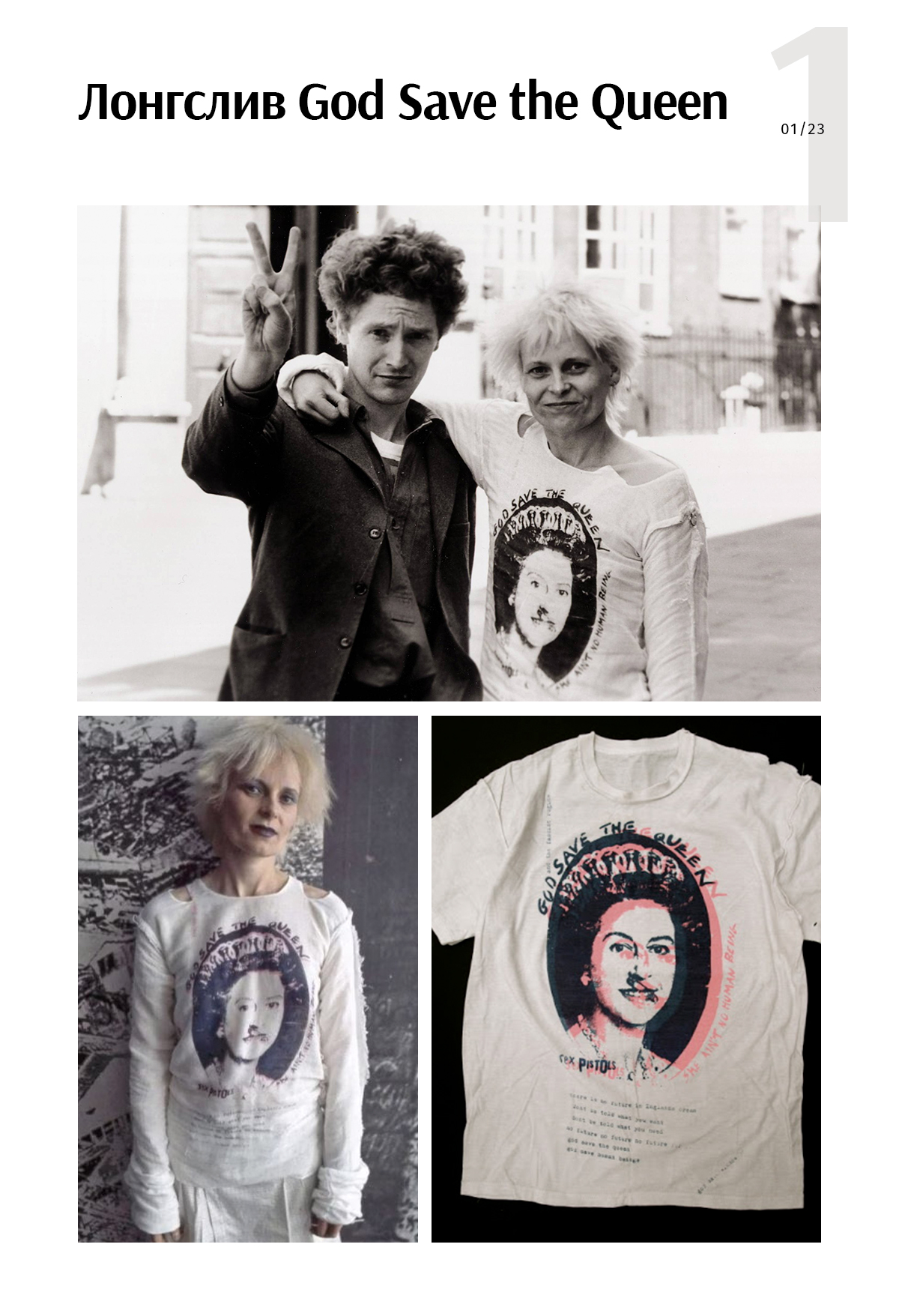 Лонгслив God Save the Queen — самая известная футболка с изображением Елизаветы II. На ней верхняя губа королевы проколота булавкой. Сам портрет в овальной рамке создал британский художник Джейми Рид для обложки альбома Sex Pistols. Вивьен принадлежит идея поместить это изображение на футболку. Такой поступок мог бы возмутить Елизавету, но нет — сегодня лонгслив хранится в коллекции музея V&A в Лондоне, а это музей королевы Виктории и принца Альберта. Там же находится еще одна культовая футболка от Вествуд — со свастикой и надписью destroy.