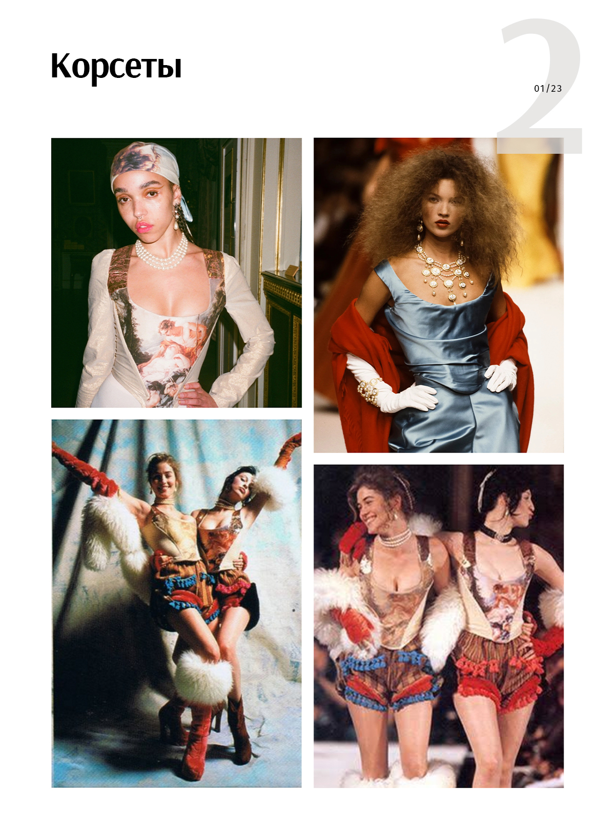 Вивьен Вествуд много работала с историческим костюмом и умело соединяла старинные элементы одежды с современными тенденциями. Так она показала, что корсет может быть частью повседневного образа. Она переосмыслила этот предмет гардероба еще в 1970-х, но самыми популярными стали ее корсеты с картинами из коллекции весна-лето 1990.