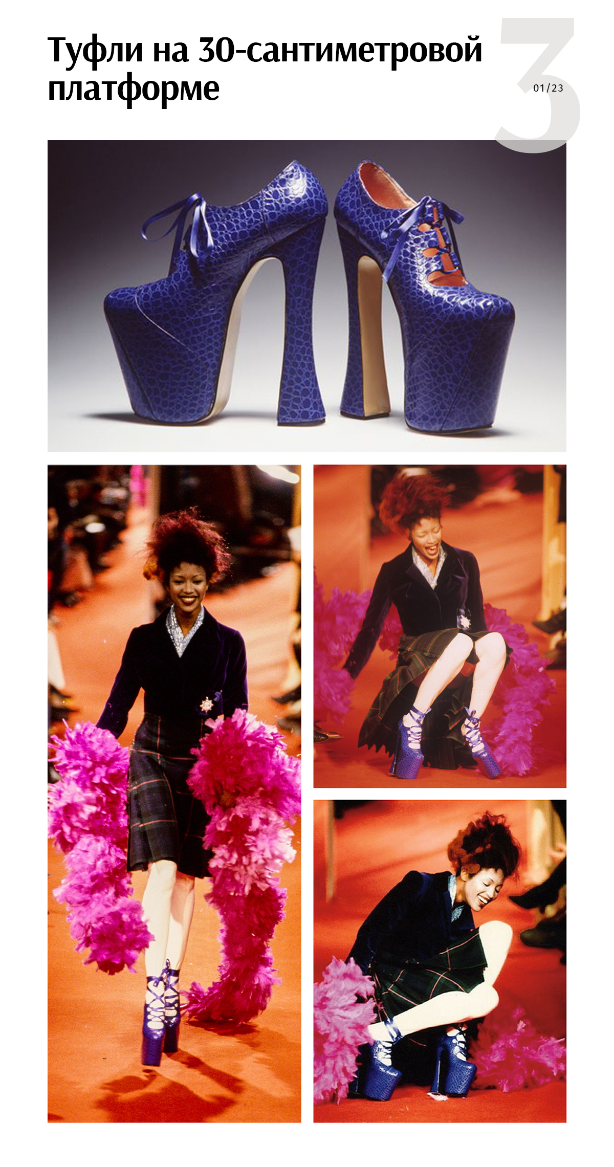 Выход, а точнее падение топ-модели Наоми Кэмпбелл на показе Vivienne Westwood, привлек много внимания к самому событию и туфлям на 30-сантиметровой платформе. Интересно, что по законам модной индустрии после такого инцидента Наоми должна была лишиться контрактов, но этого не произошло, и более того, принесло бешеную популярность показу. В дальнейшем многие бренды даже просили модель повторить падение, чтобы получить такой же эффект.