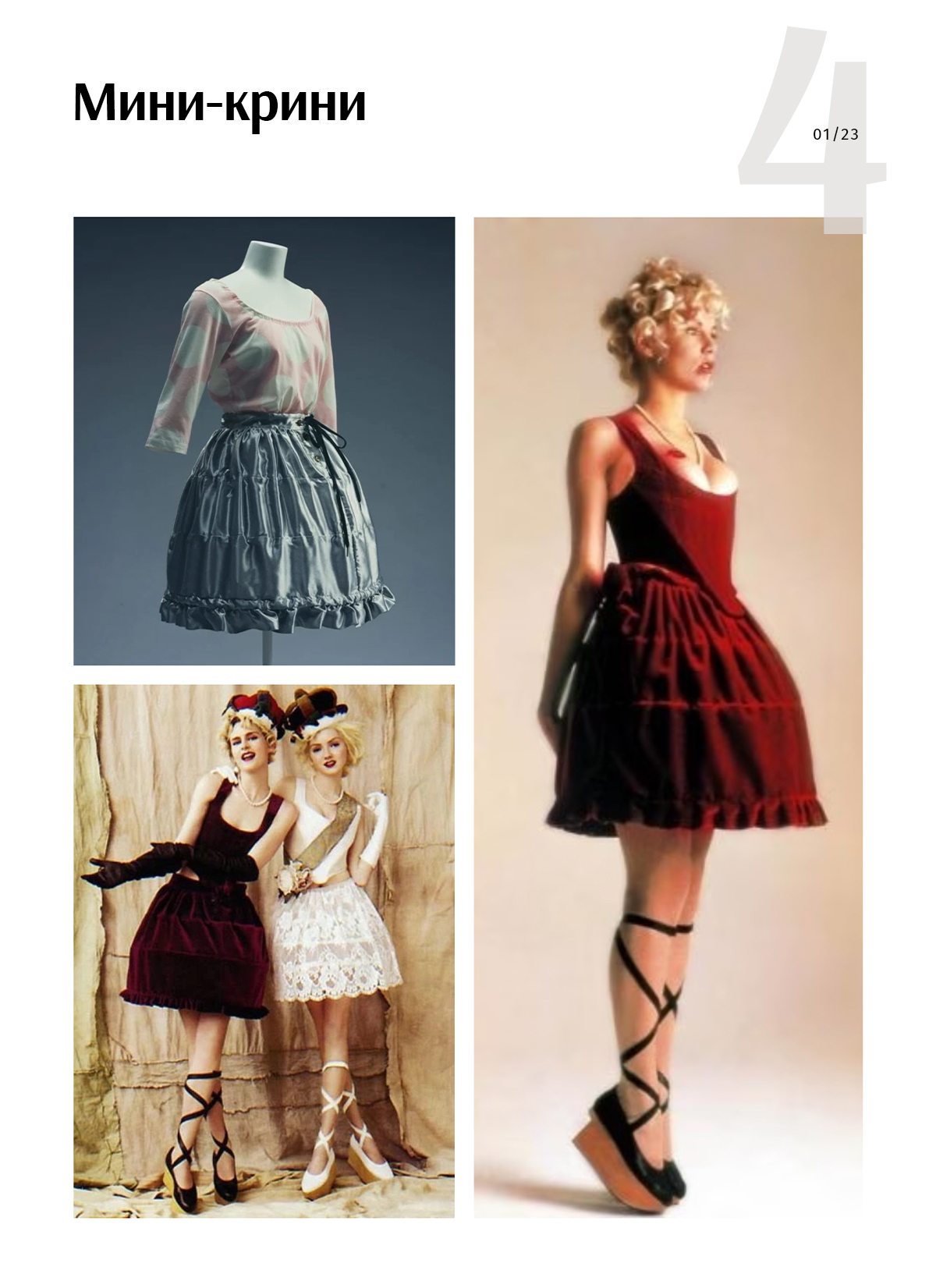 Мини-крини — название коллекции весна-лето 1985. Показ, на который дизайнера вдохновила викторианская эпоха. Оттуда и пошел тренд на нижнее белье напоказ.