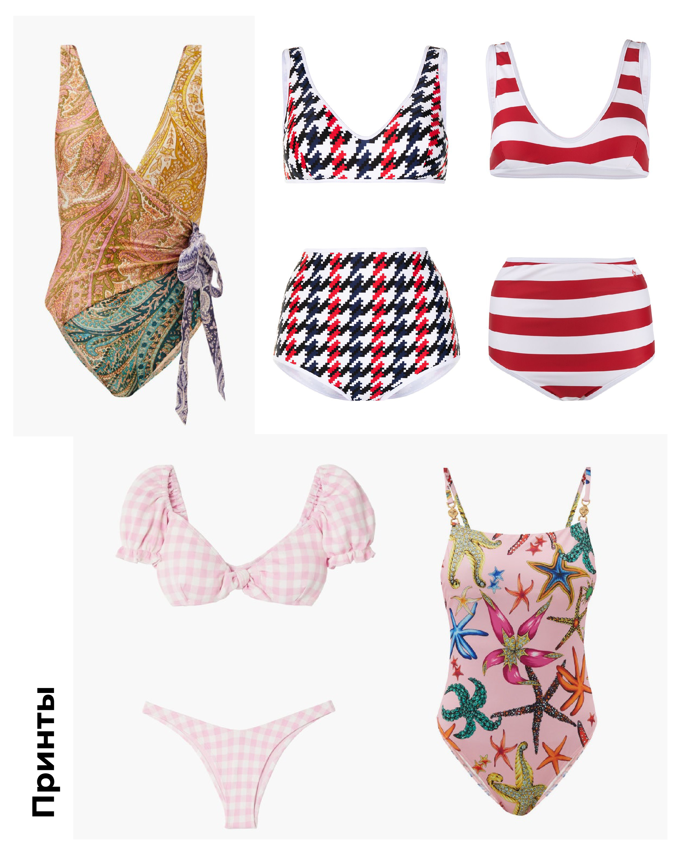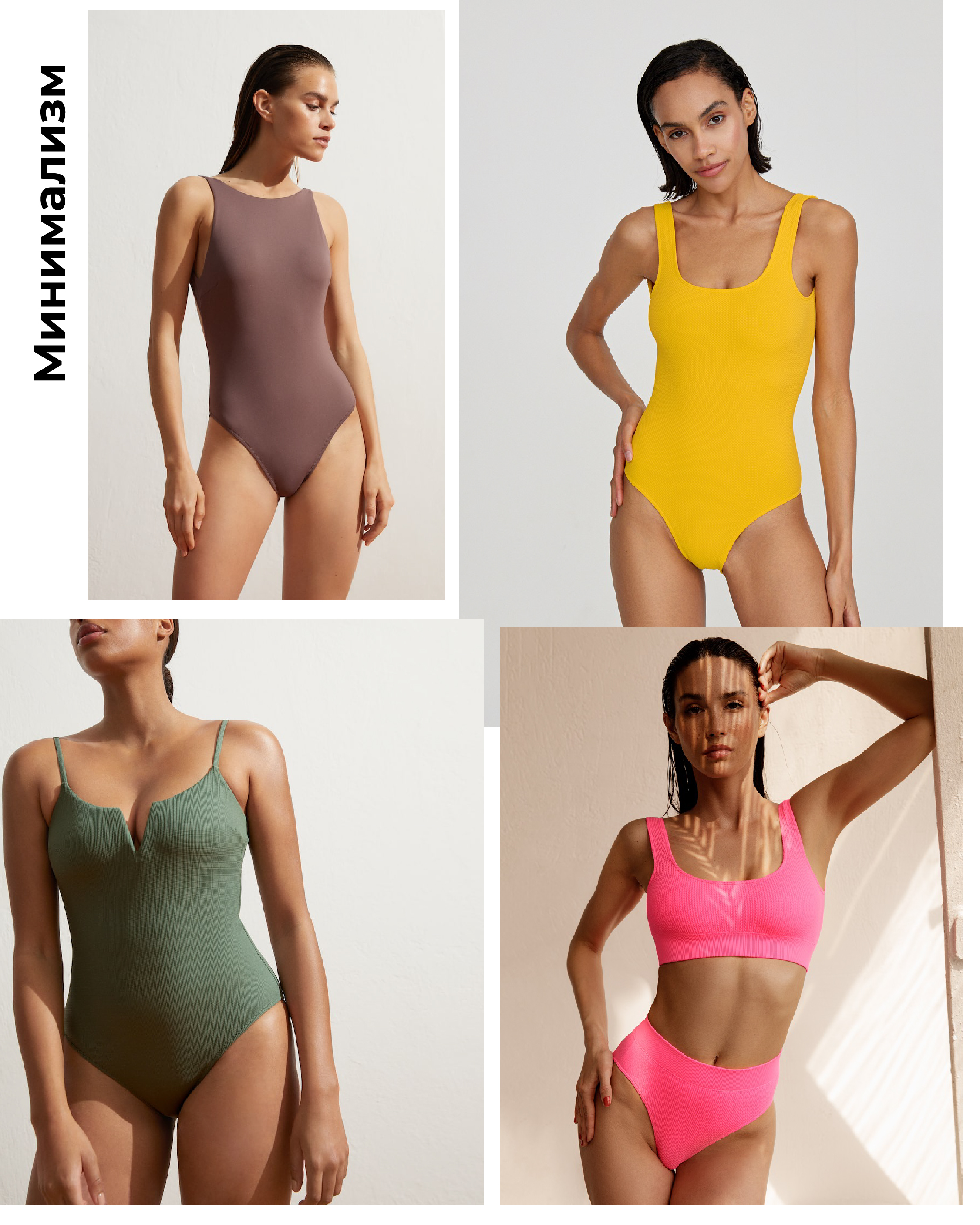 Однотонные топ и трусики без принтов и декора — идеальный выбор для тех, кто ищет простые и одновременно актуальные решения. Форму трусиков выбирайте ту, в которой вам комфортно. На пике трусики с завышенной талией и топ-бандо (повязка) или в спортивном стиле. Если вы любите закрытые купальники, то присмотритесь к однотонным со спокойными вырезами или открытой спиной.