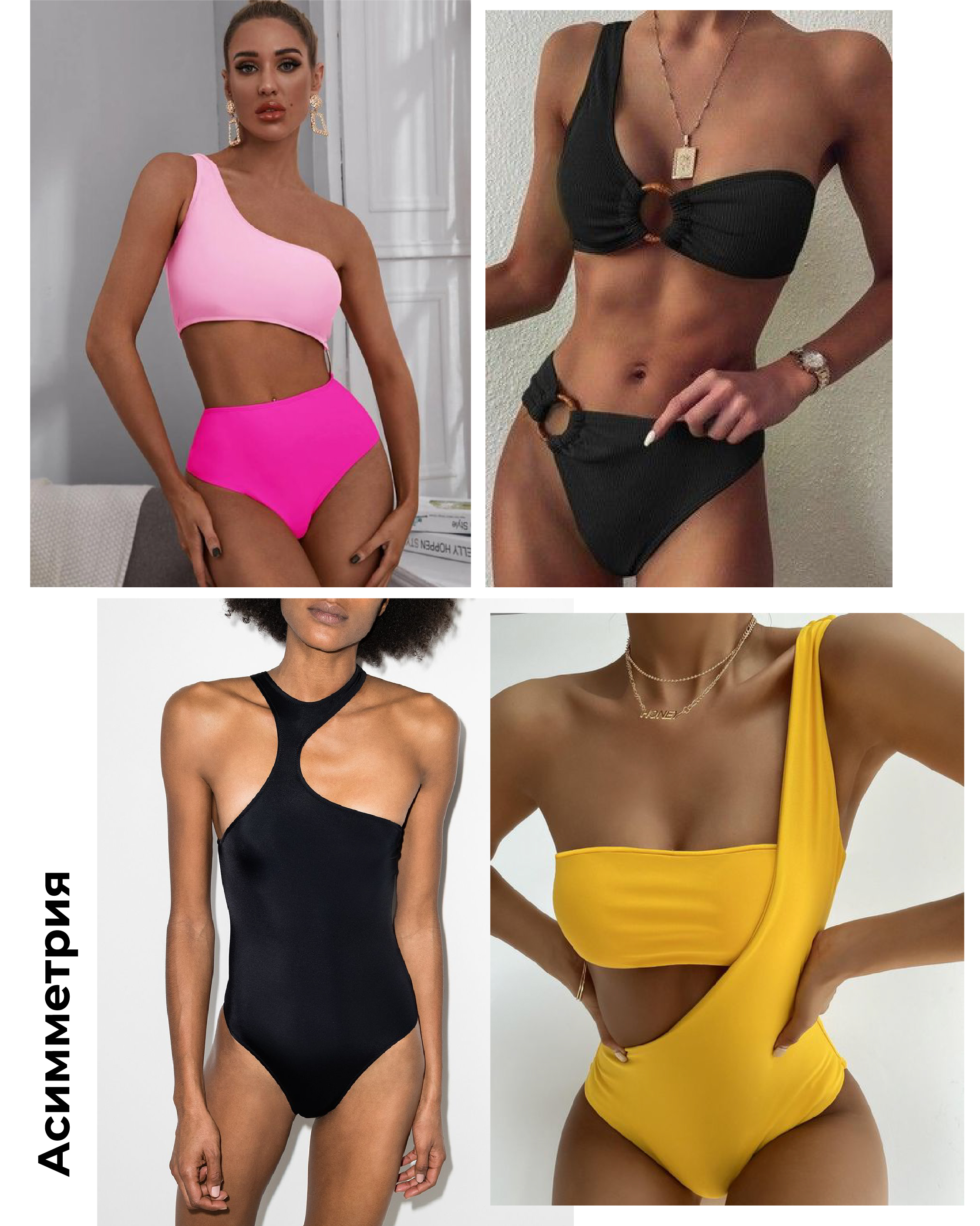 Асимметрия актуальна не только в платьях и юбках, но и пляжной моде. Закрытые купальники на одно плечо, открытые с асимметричным лифом — это очень модно.