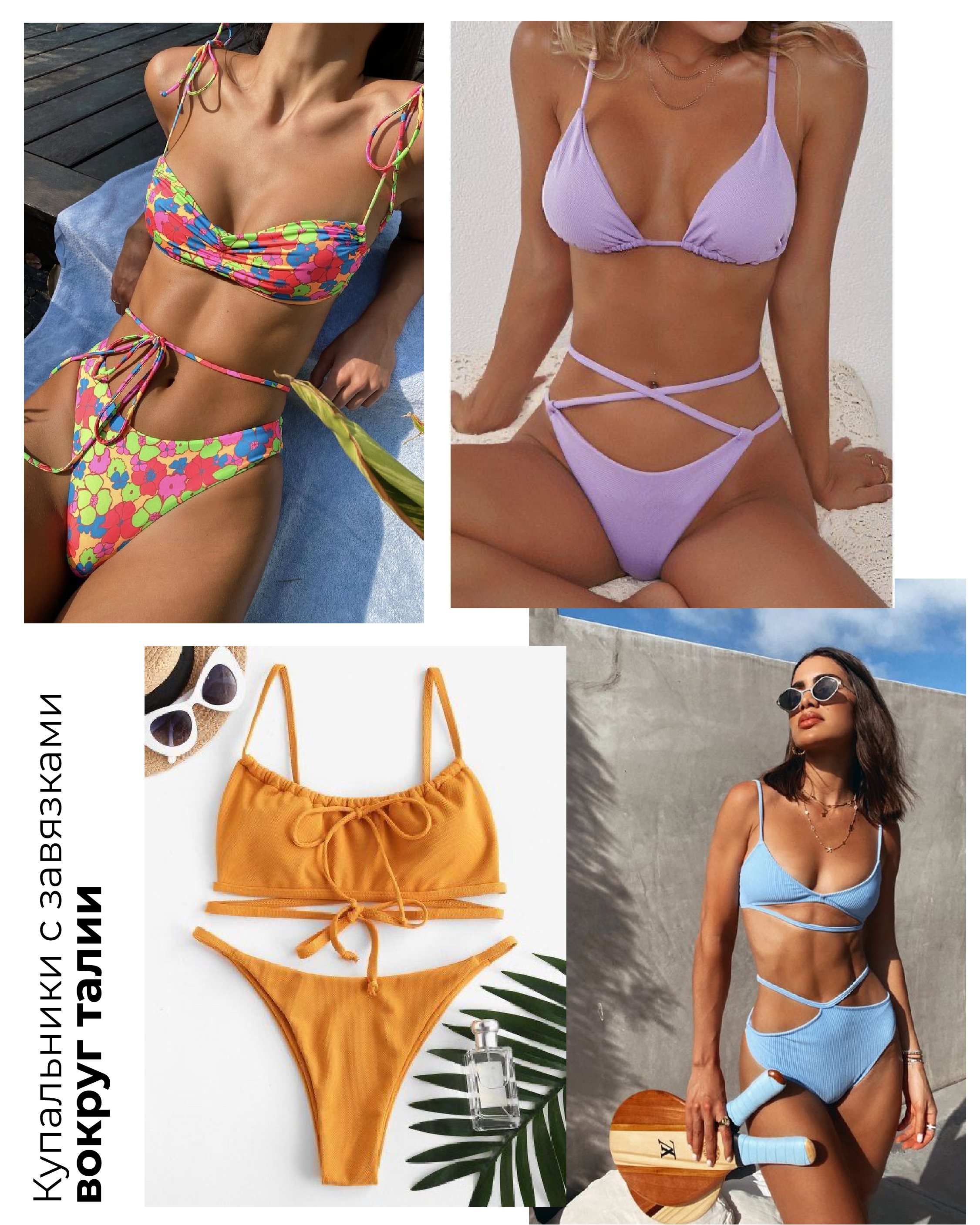 Завязки вокруг талии прижились не только в укороченных рубашках, но пришли и в купальники. Веревочки могут идти как от топа, так и от плавок.