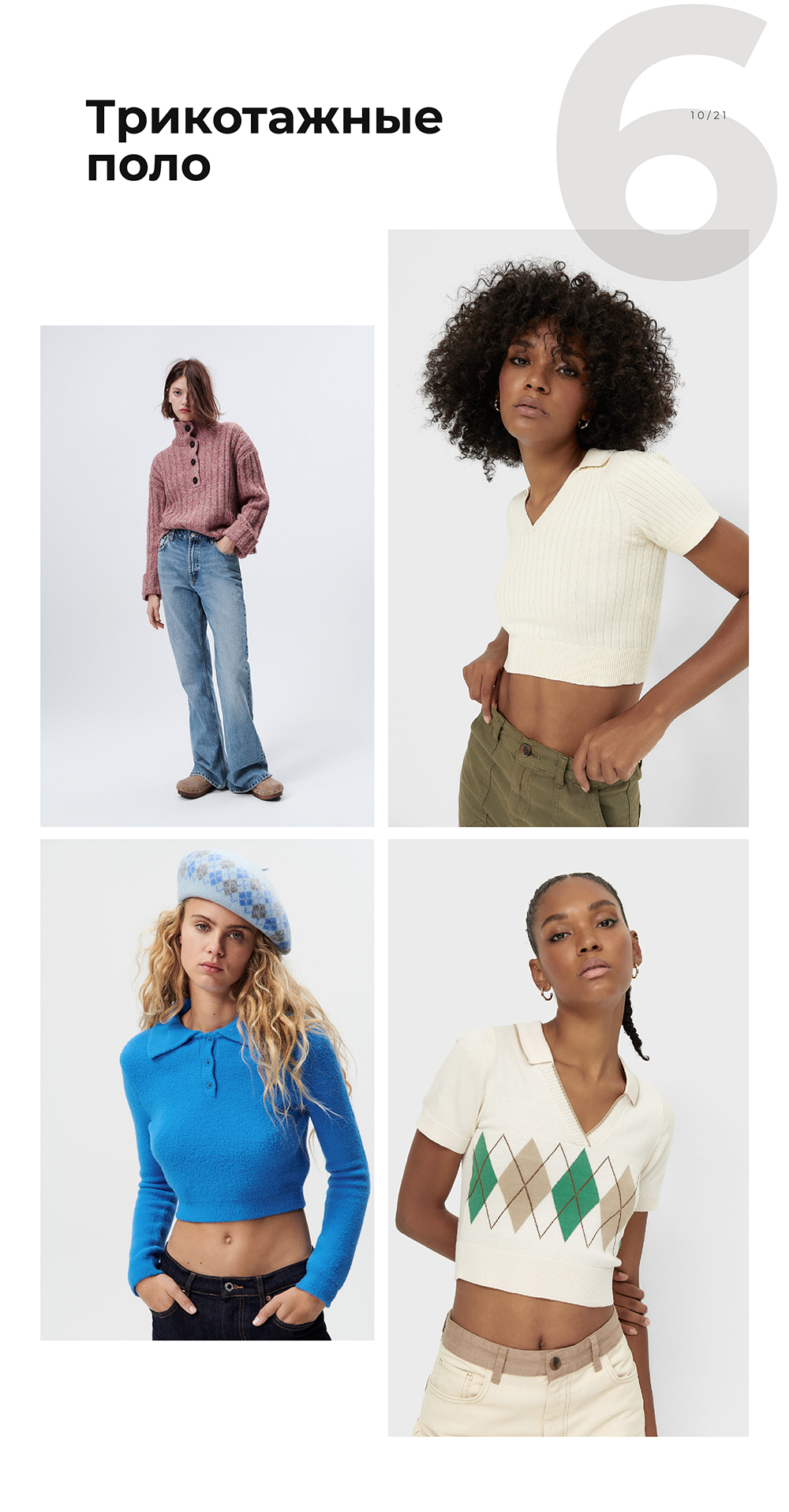Трикотажные поло снова в деле. Они могут быть по фигуре или оверсайз. Вернулись в поддержку моды на ретро.