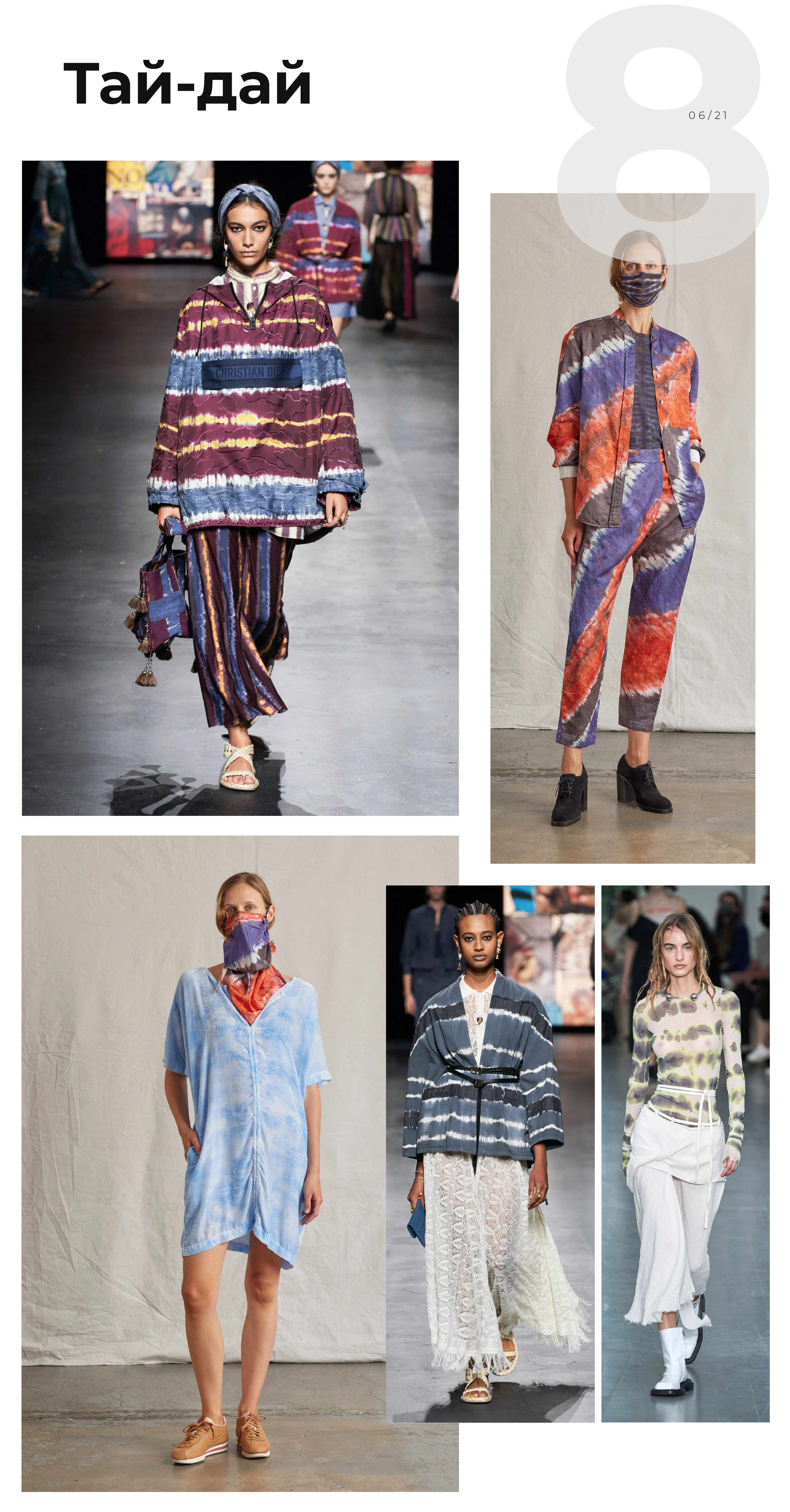 Тай-дай — ярко, по-летнему, тоже один из лидеров, который, как и цветы, возвращается уже не первое лето. Это принт с расплывающимися пятнами краски.