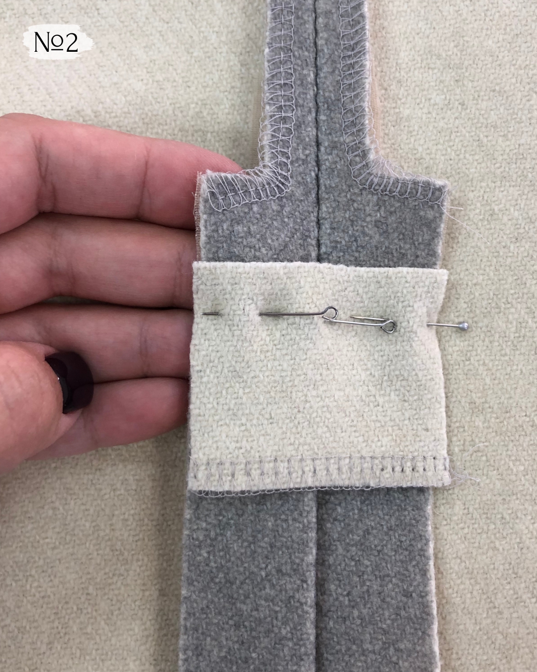 2. Вырежьте деталь усилителя разреза: прямоугольник длиной, равной ширине припуска × 2, чтобы она закрывала обе стороны. Один длинный срез этой детали обработайте на оверлоке. Приложите усилитель разреза лицевой стороной на припуски разреза. Приметайте его и притачайте на швейной машинке.