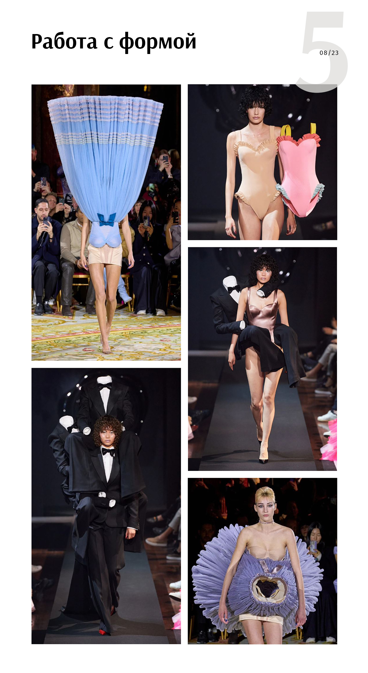 Многие из дизайнеров в прошлом архитекторы, и игра с формой не осталась далеко в 1960-х, когда Пако Рабан экспериментировал с неносибельными материалами. Сегодня это тоже популярная тема. Например, Viktor&Rolf, чьи показы не только мемы, но и эксперименты с формой и конструкцией, которая лежит в ДНК бренда.
