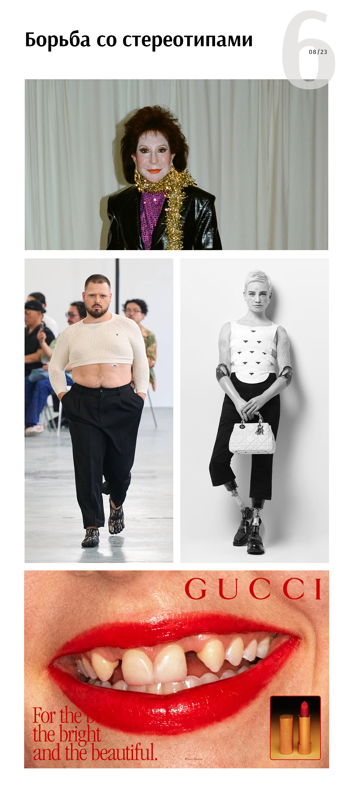 Борьба со стереотипами о красоте тоже занимает важное место среди целей «дивных» показов и продуктов. Сегодня глобальный тренд — инклюзивность. Стандартные параметры красоты не в почете, и часто подиум напоминает «антикрасоту» в стереотипном ее понимании, чтобы показать, что подиум — для всех.