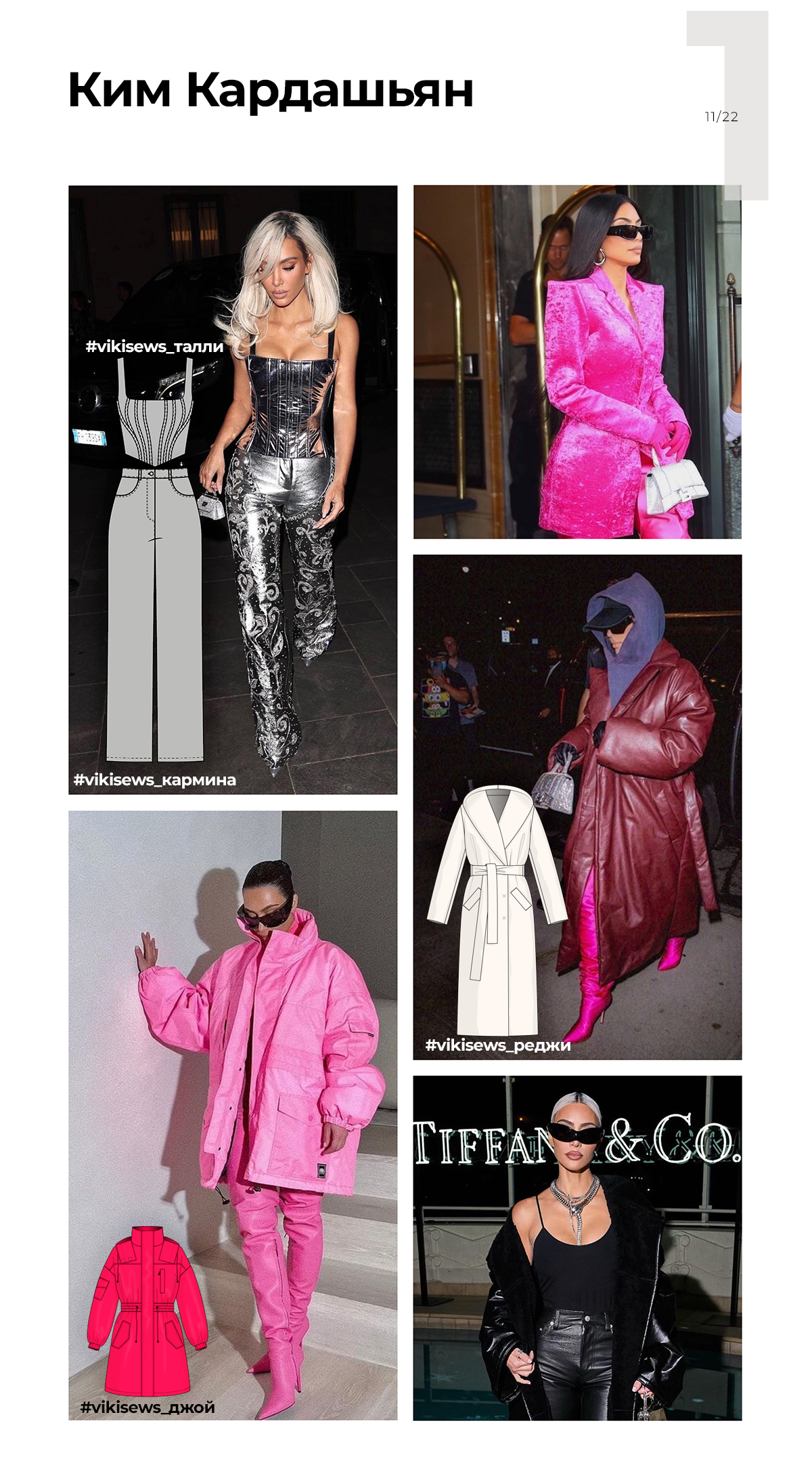 Недавно мы посвятили отдельную статью истории становления Ким Кардашьян фешен-инфлюенсером. Теперь предлагаем посмотреть, какие модели по выкройкам Vikisews она носит: брюки Кармина, пальто Глэдис, топ Талли, парку Джой.