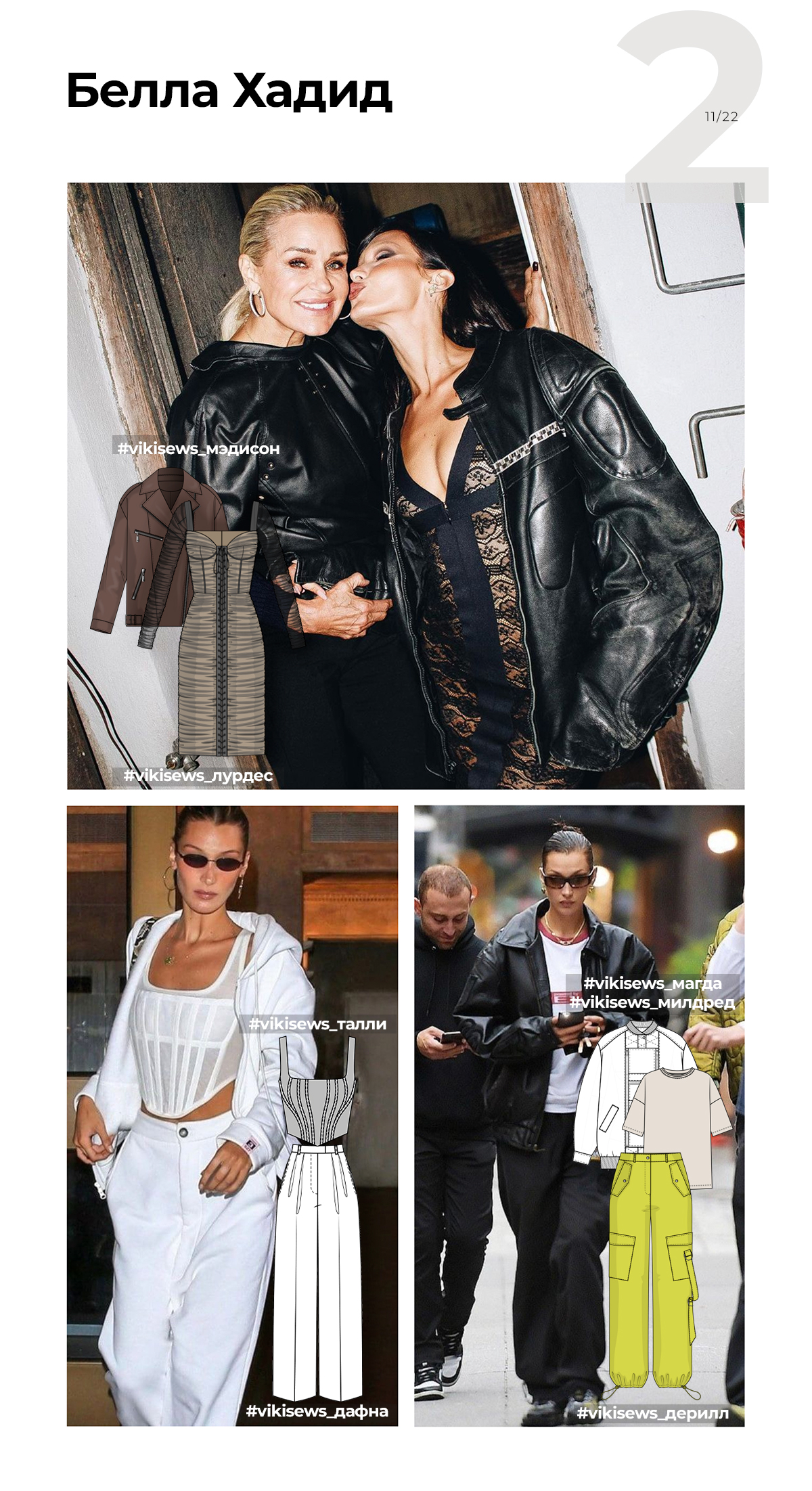 Образы Беллы Хадид сексуальные, женственные и немного дерзкие. Она мастерски работает с фактурами. На ней мы заметили куртку-косуху Мэдисон, платье Лурдес, брюки палаццо Дафна, бомбер Милдред.