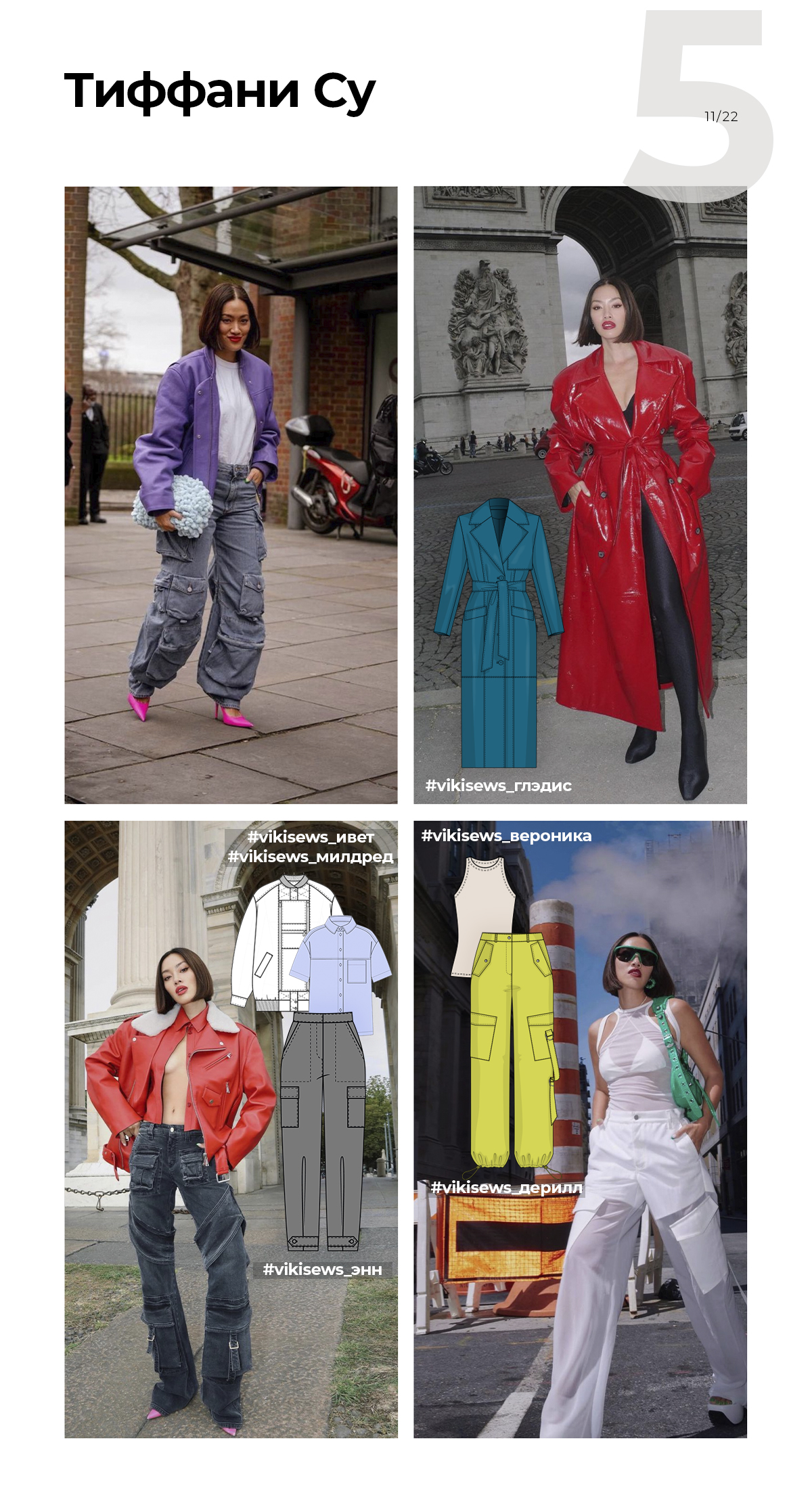 Тиффани Су в своих образах объединяет женственность и маскулинность. Вам откликается такое сочетание? Составьте подобные комплекты по выкройкам брюк карго Энн, пальто Глэдис, топа Вероника, рубашки Ивет.