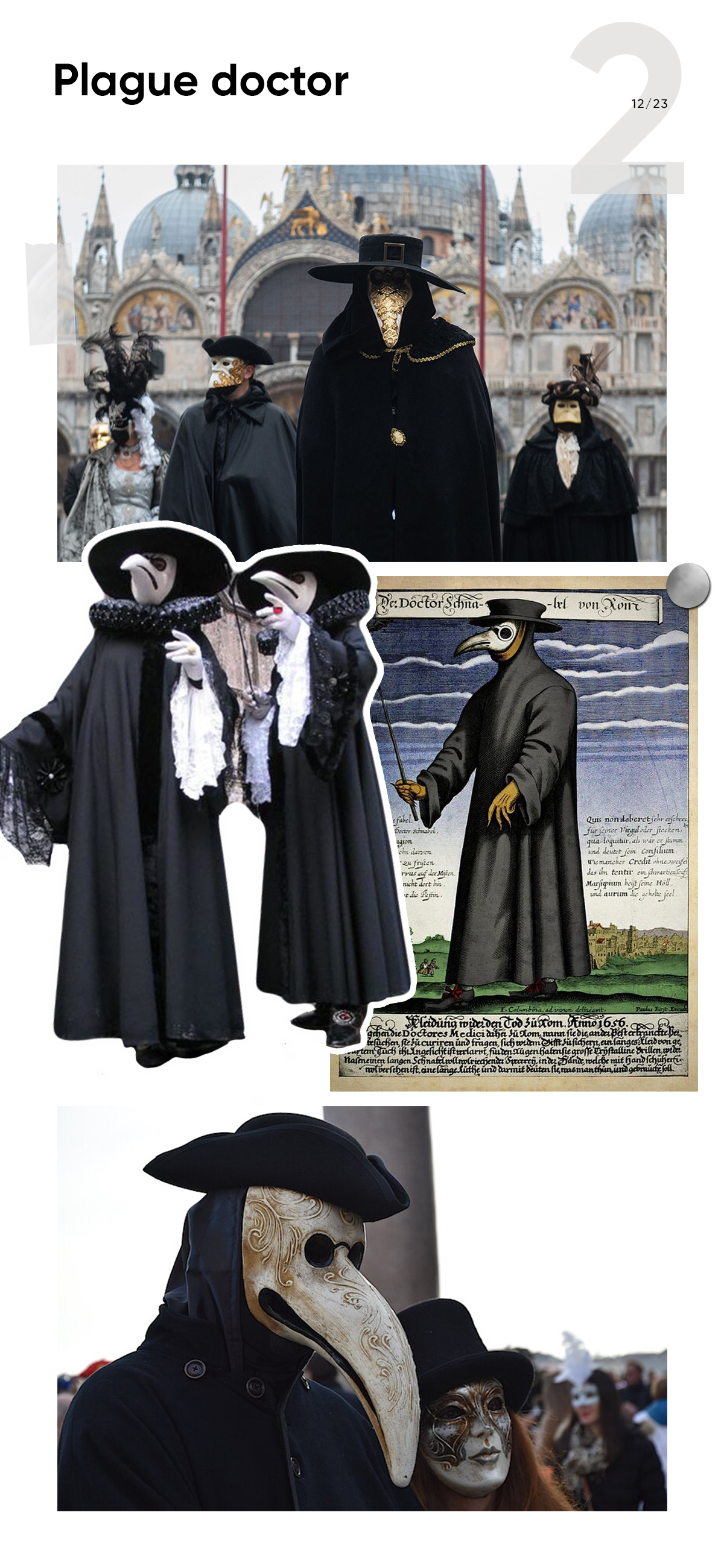 Plague Doctor is probably the most recognizable Venetian mask of them all. These masks were actually worn by doctors who visited and treated people sick with the plague. It is believed the mask and costume were invented by Charles de Lorme. The leather outfit was meant to protect the wearer from plague, and the long-beak mask was supposed to work as an air filter thanks to medicinal herbs inside. The doctors used to insert special sponges soaked in labdanum up their noses for additional protection.