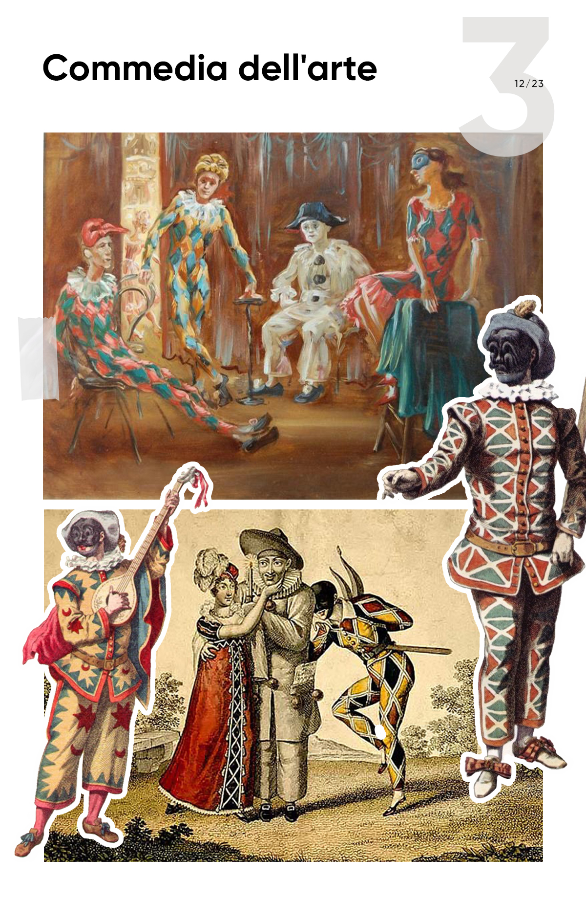 In 16th-century Italy troupes of traveling comedy actors were very popular. Later they were called Commedia dell’arte. The most popular characters, such as Harlequin, Colombina, Pulcinella, etc., each had their unique traits and clothing styles. Performers acted wearing character masks that are now in demand among the carnival participants.