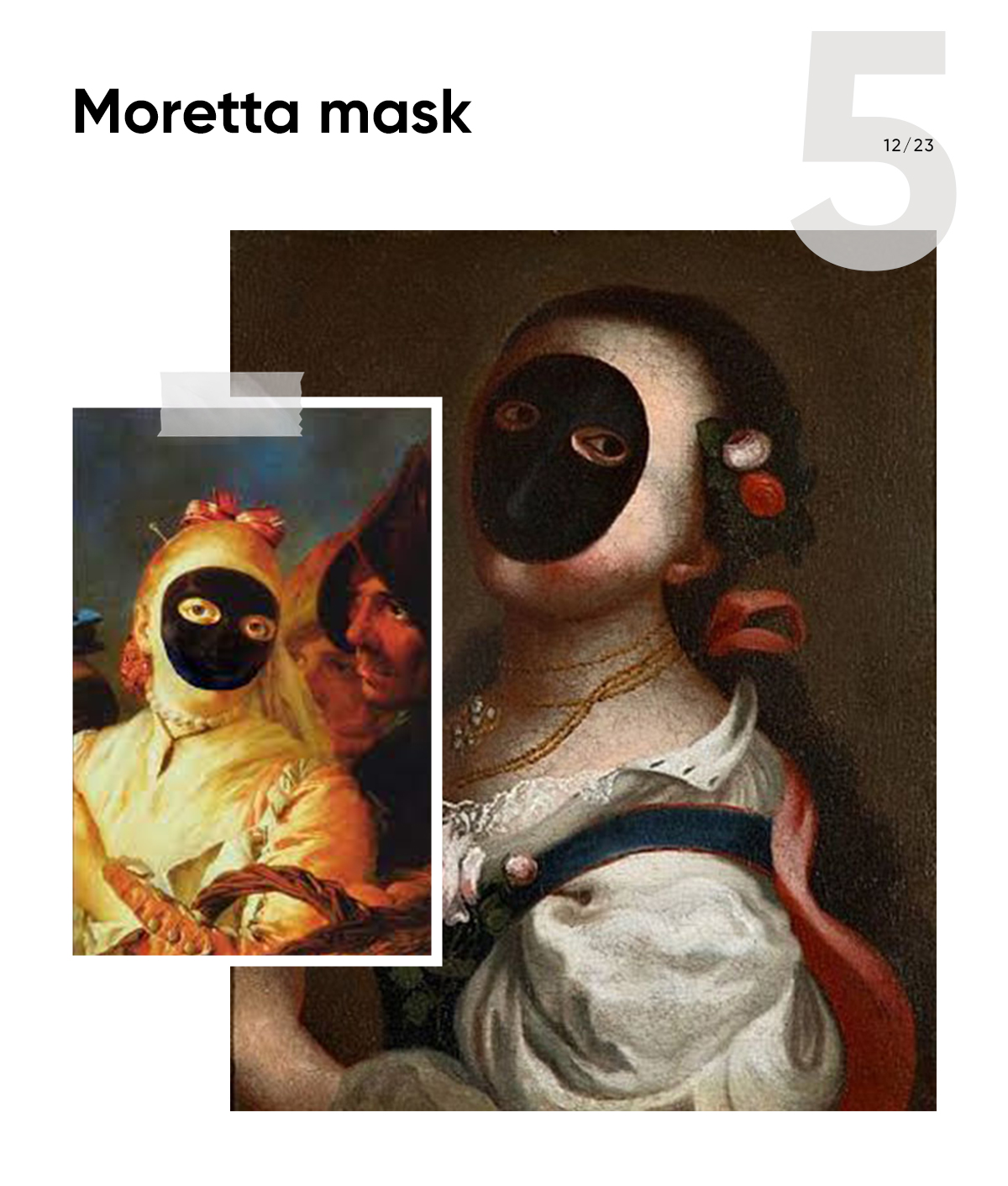 There is an anecdote about the Moretta mask. It was considered men’s favorite – Casanova said it made women especially attractive… because women couldn’t speak while wearing it. The thing is, wearers had to hold the masks with their teeth, which made them speechless for the whole night.