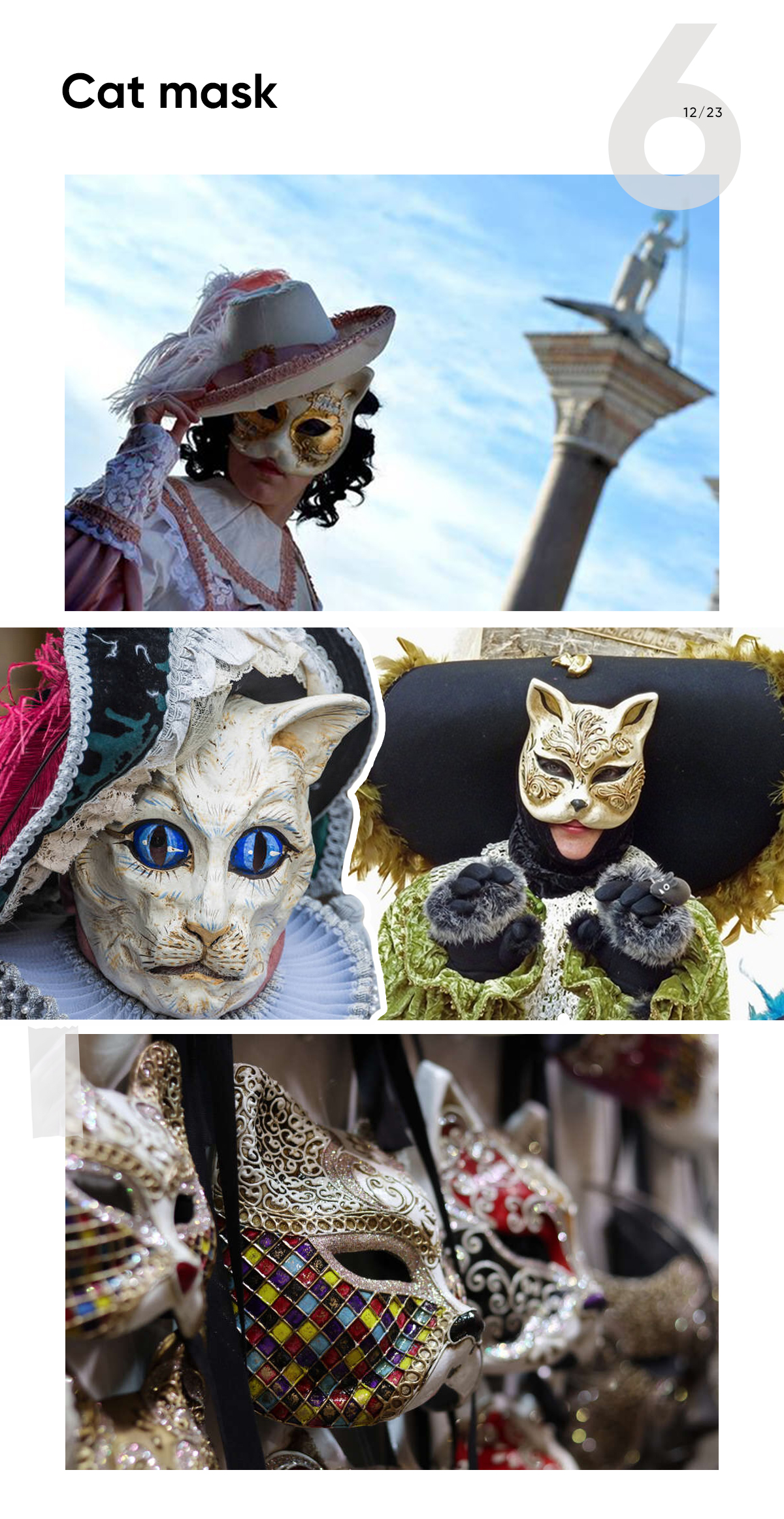 Another story is related to the Cat mask. Back in the day, there were almost no cats in Venice. People expressed their interest in cats using the carnival costumes. The tradition is still strong today.