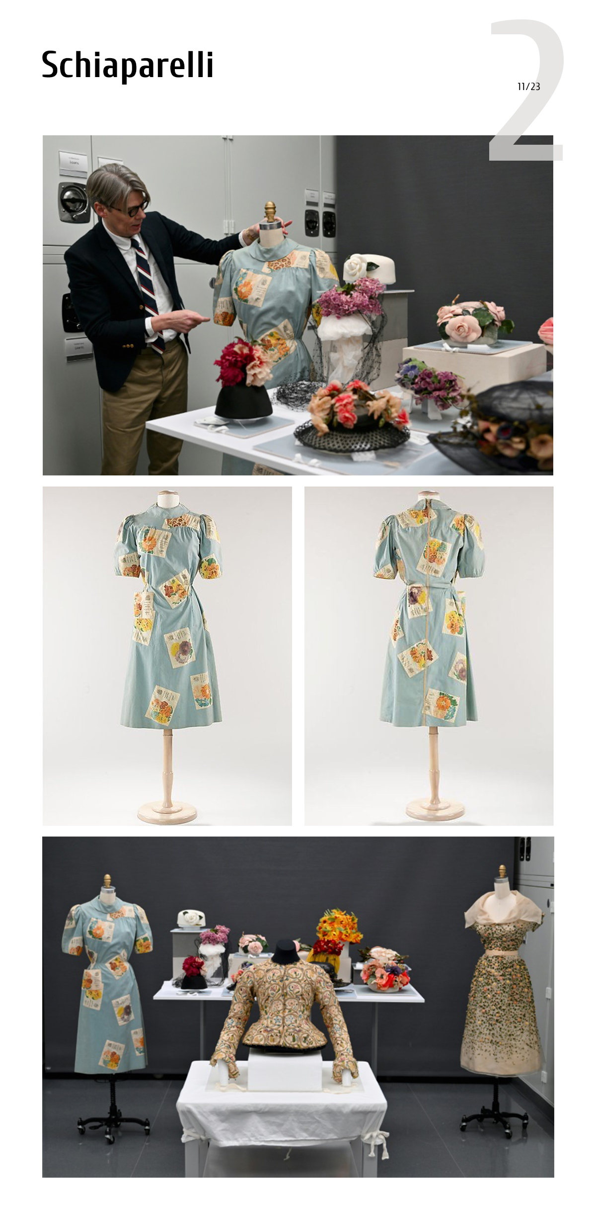 In particular, the visitors will see a peculiar Schiaparelli dress with appliques resembling flower-seed packets. This dress, alongside some other garments, was gifted to the Museum by Millicent Huttleston Rogers, a fashion icon, jewelry designer, and prominent art collector.