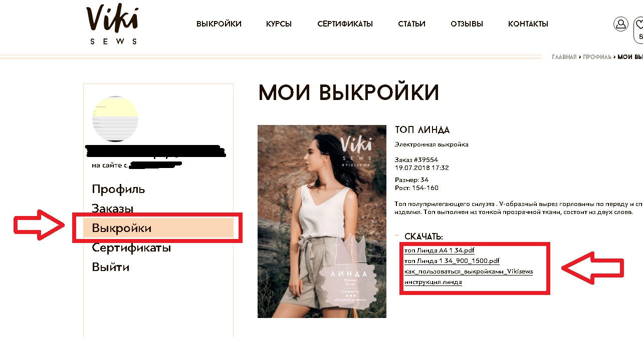После успешного входа в личный кабинет перейдите в раздел Выкройки (станет доступен после входа в личный кабинет) личного кабинета и скачайте приобретенные файлы.