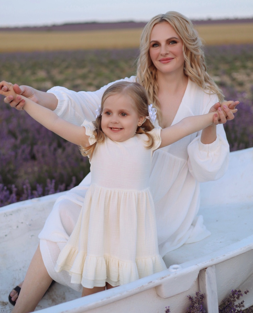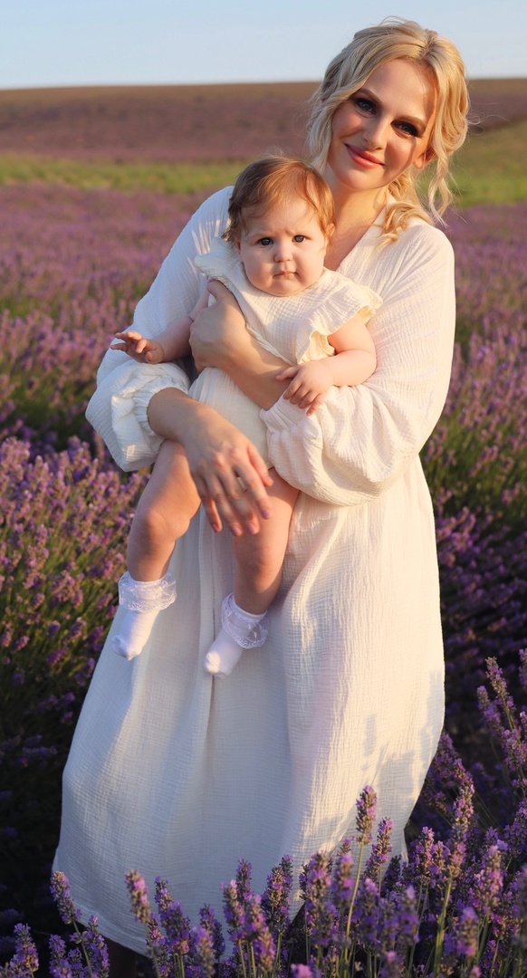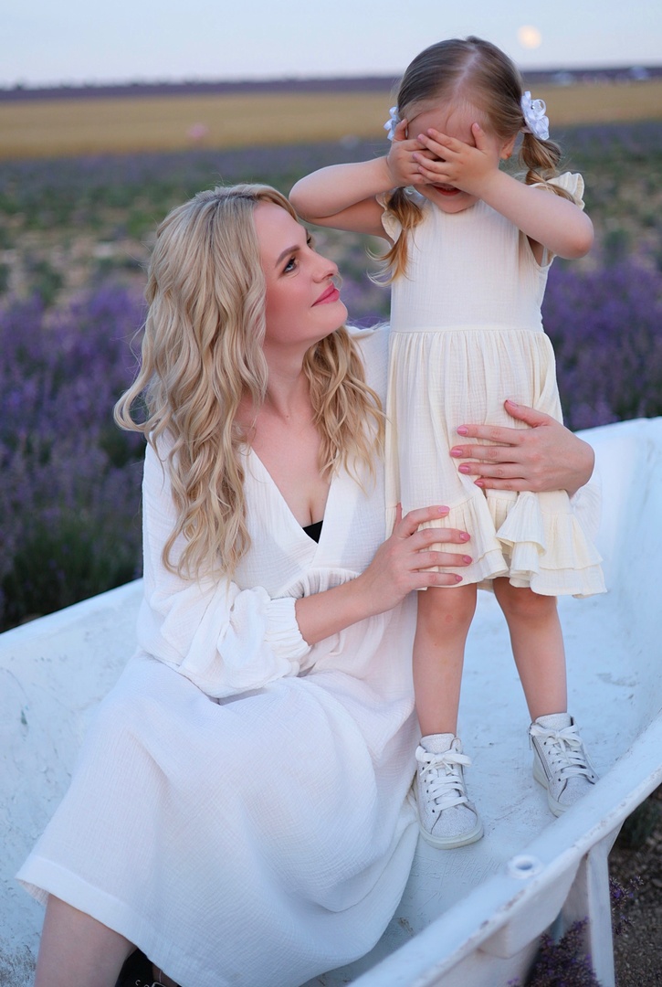Шила из муслина молочного цвета для фотоссесии с детьми в лавандовом поле